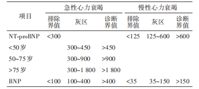 注:NTproBNP为N末端B型利钠肽前体;肥胖患者(BMI≥30kg/m2 )NTproBNP诊断界值应降低50%;房颤患者NTproBNP诊断界值应提高 20%~30%;肾功能不全[估算肾小球滤过率(eGFR)<60 ml·min-1 ·(1.73m2 )-1 ]患者,NTproBNP 诊断心衰界值应>1200 ng/L。